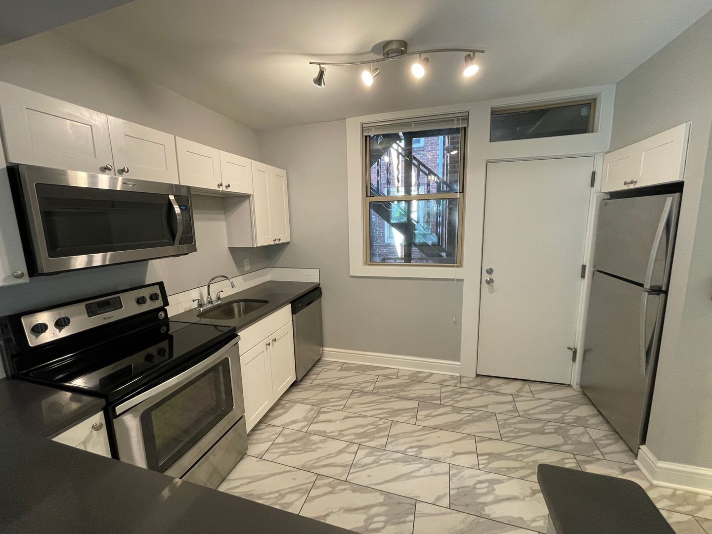Modern kitchen with refrigerator, electric stove, dishwasher, and microwave