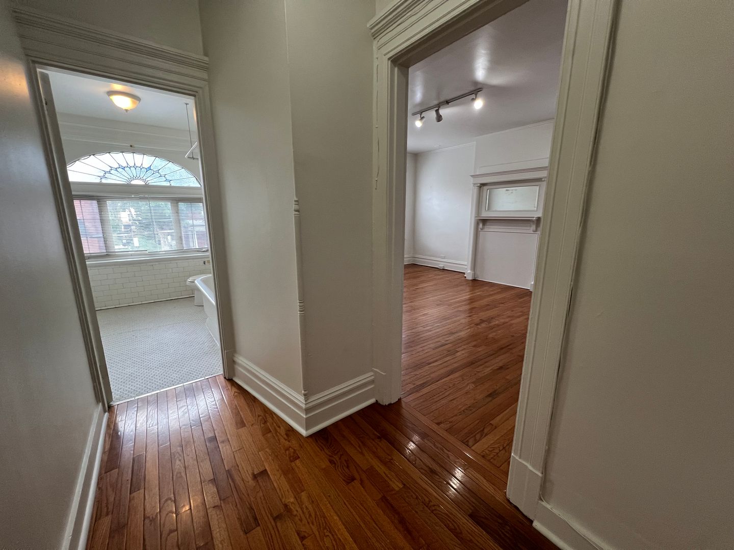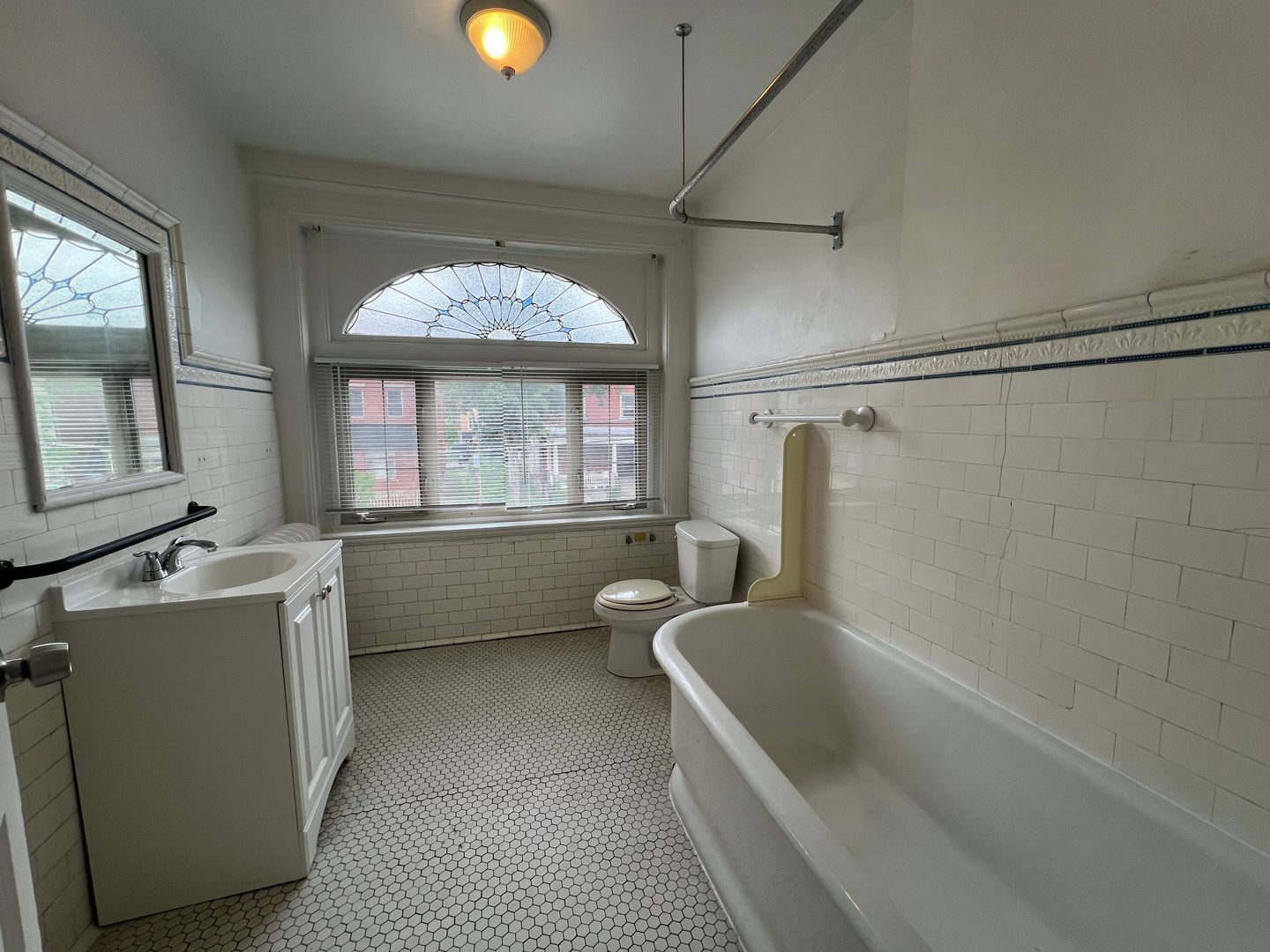 Grand bathroom with a beautiful original window, adding a unique charm