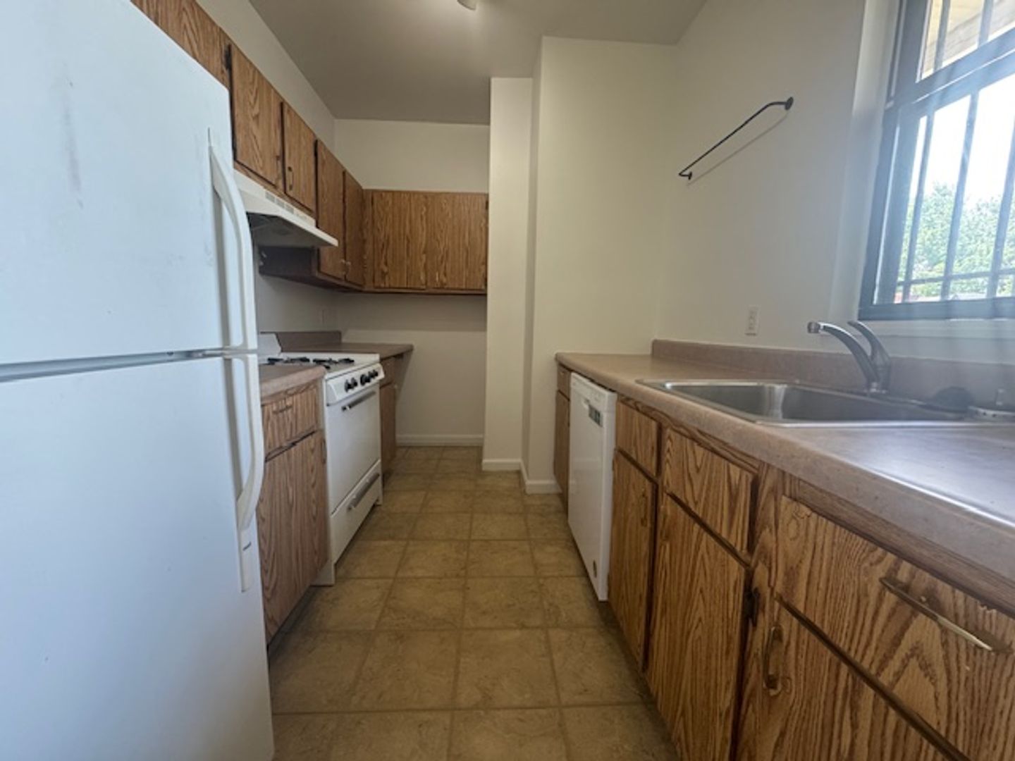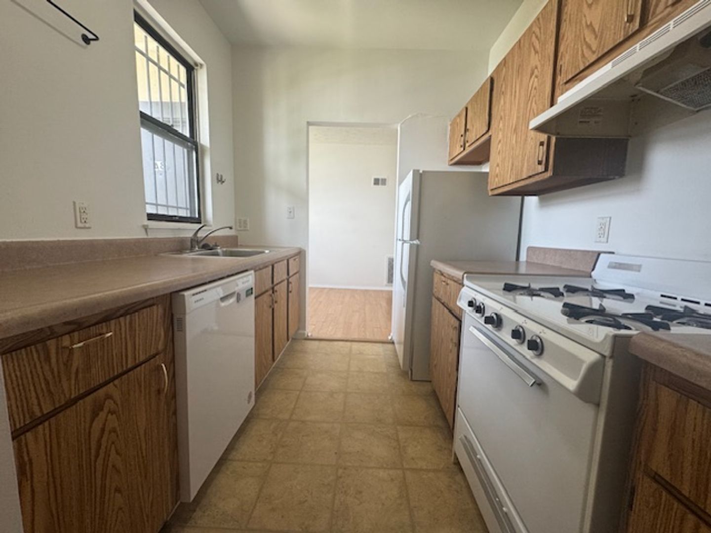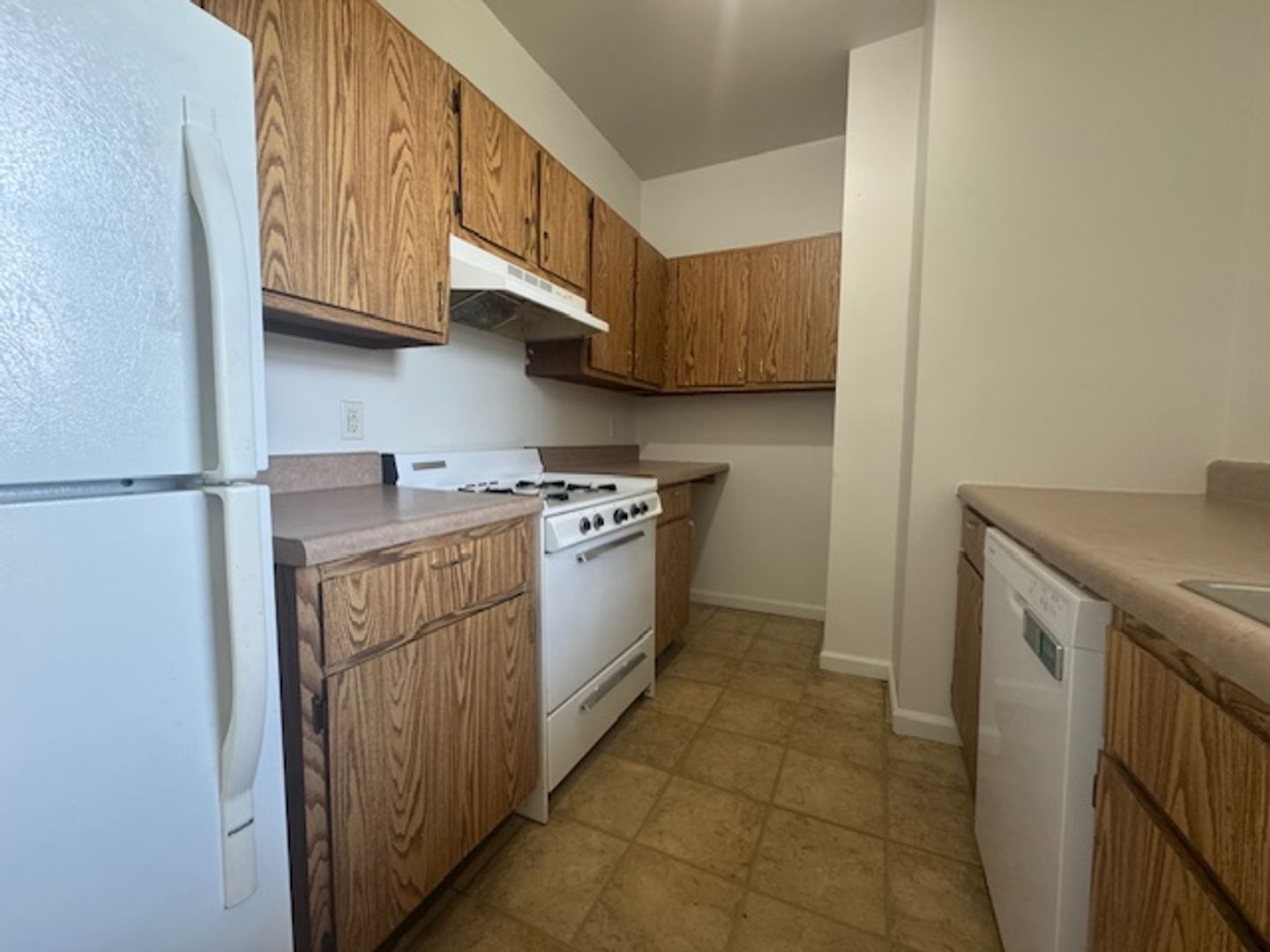 Fully equipped kitchen with a refrigerator, dishwasher, and gas stove—perfect for home chefs.
