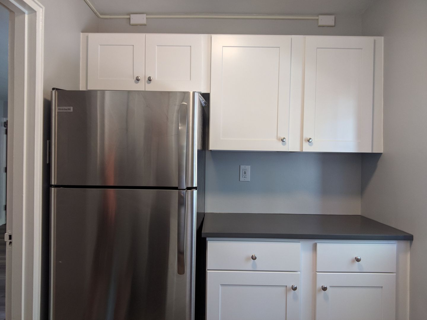 Updated kitchen with sleek white cabinets, refrigerator, gas stove, and dishwasher