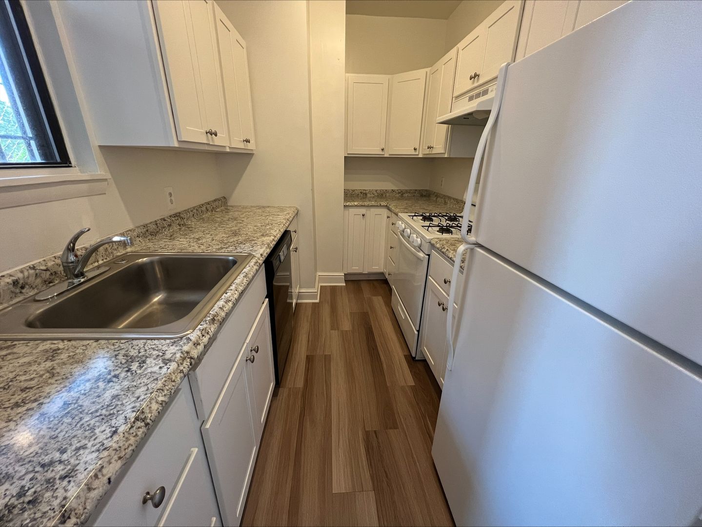 Modern kitchen with fridge, dishwasher, and gas stove—fully equipped for all your culinary needs