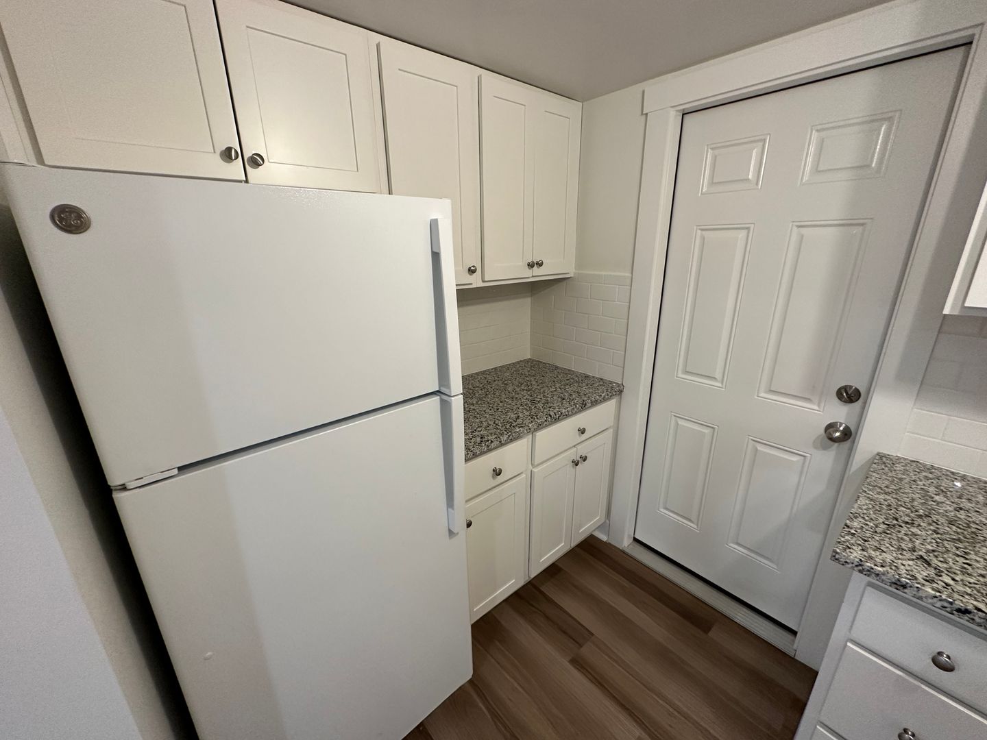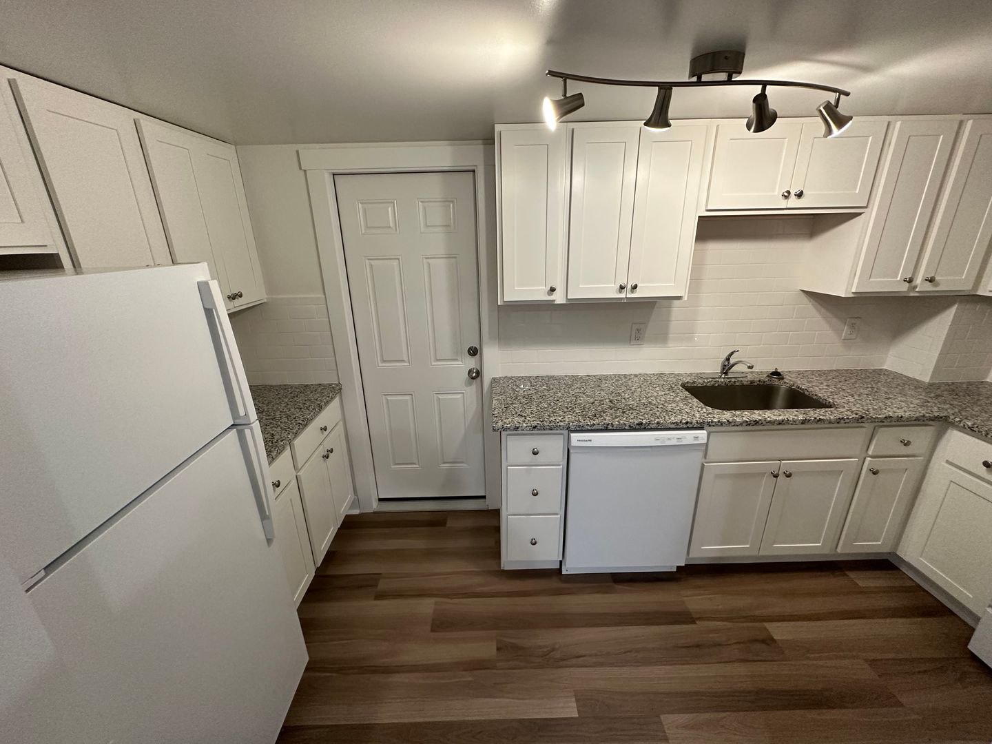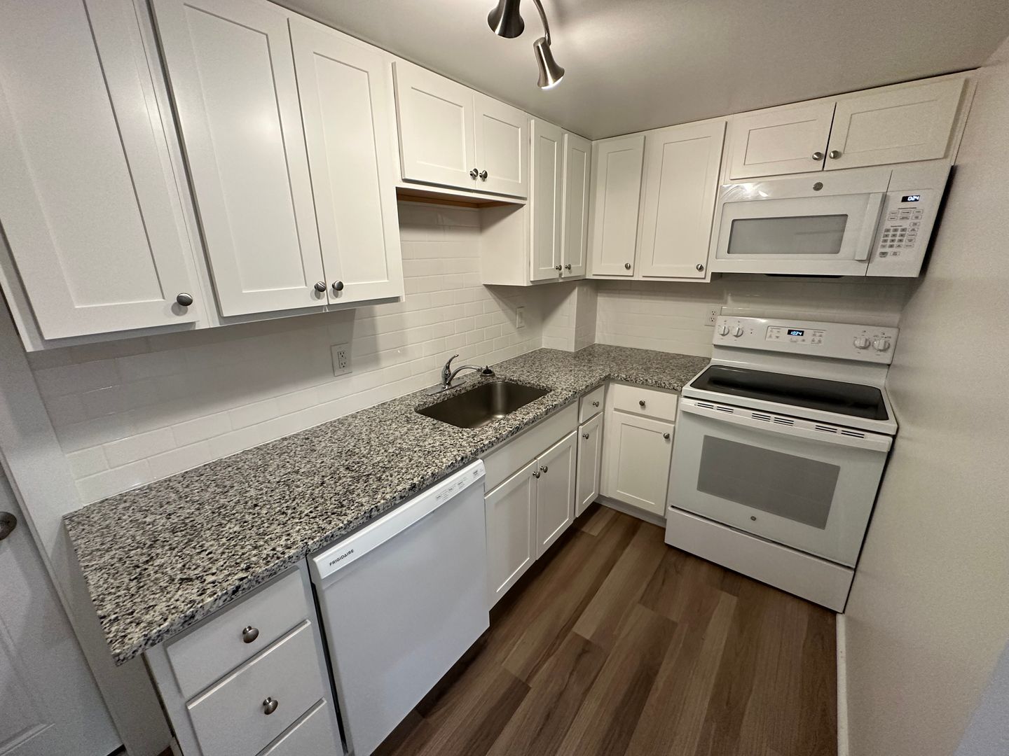 Updated Kitchen: Equipped with modern white cabinets, refrigerator, electric stove, microwave, and dishwasher