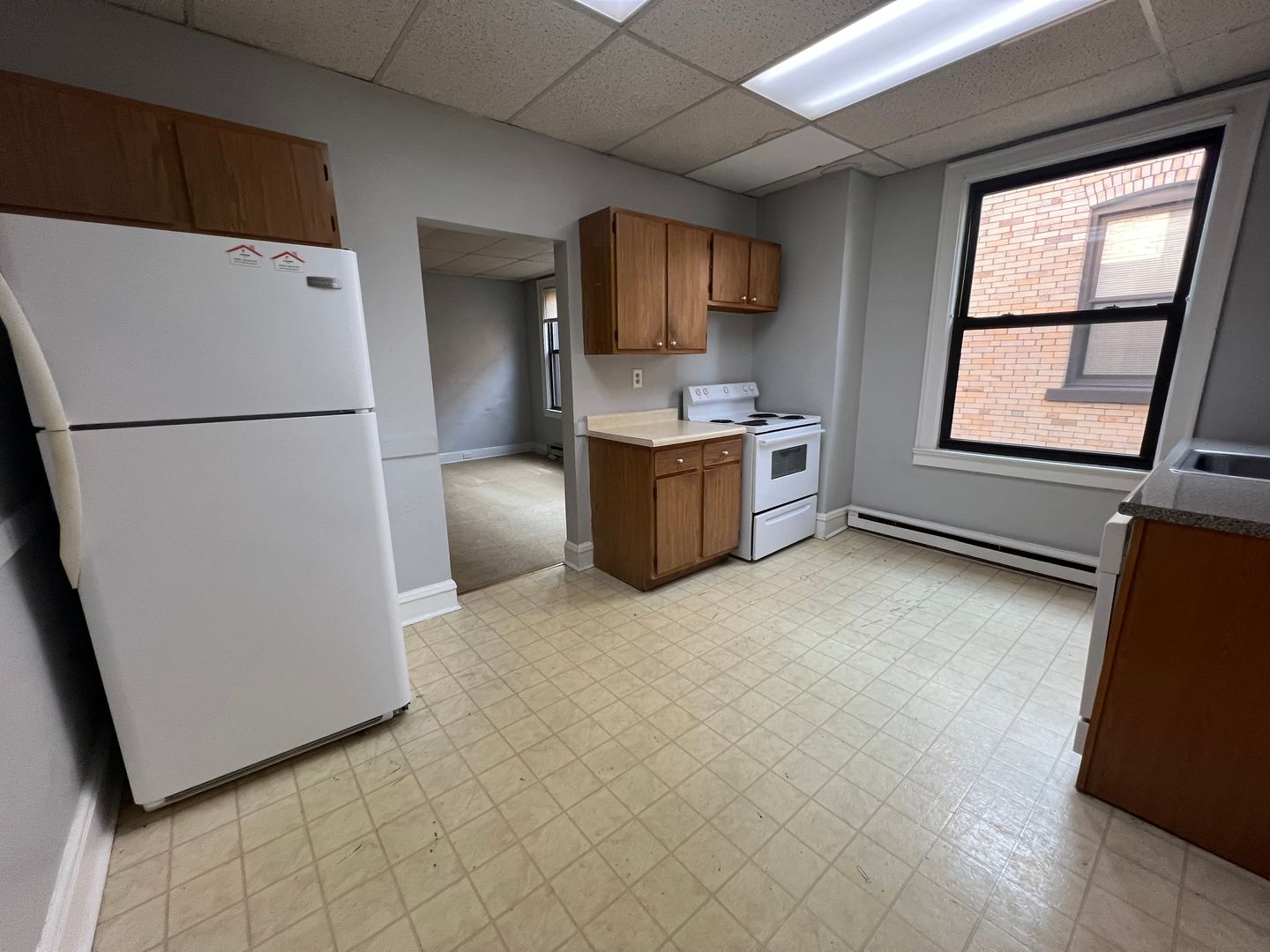 Eat-in kitchen equipped with a refrigerator, electric stove, and dishwasher