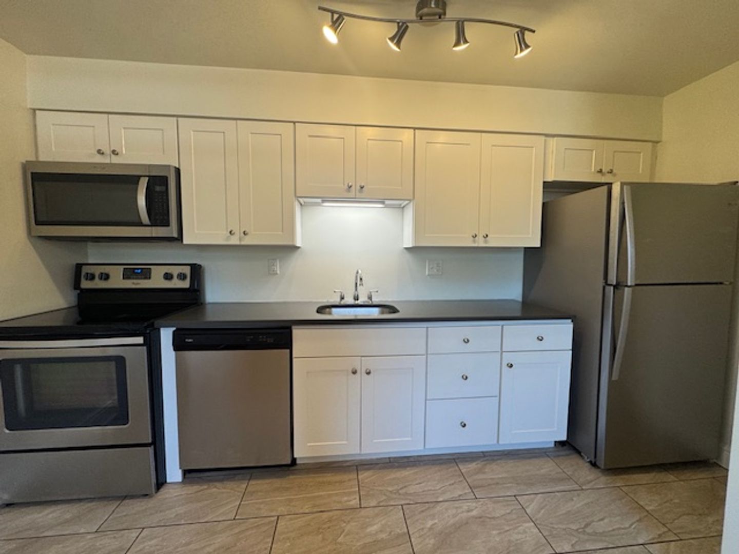 Modern kitchen featuring sleek grey quartz countertops and stainless steel refrigerator, microwave, dishwasher and electric stove