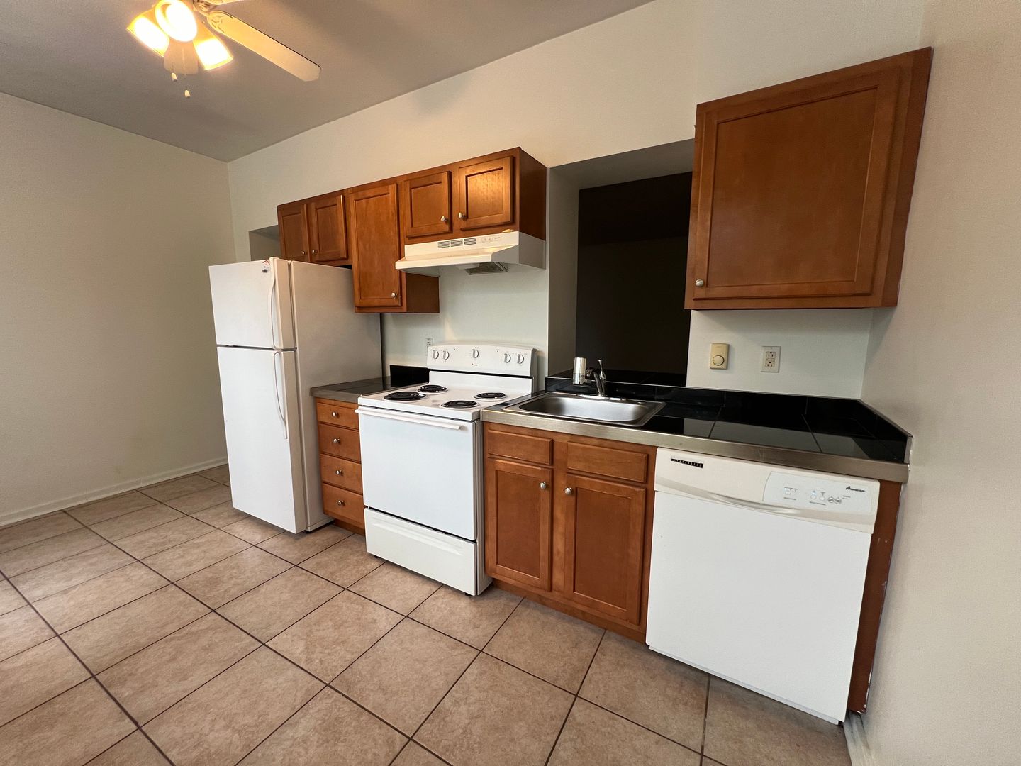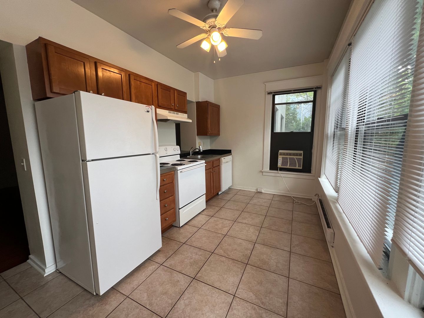 Bright, fully equipped kitchen with refrigerator, dishwasher and electric stove