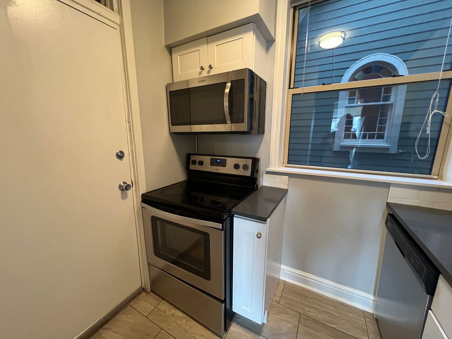 Modern kitchen with refrigerator, electric stove, microwave, and dishwasher