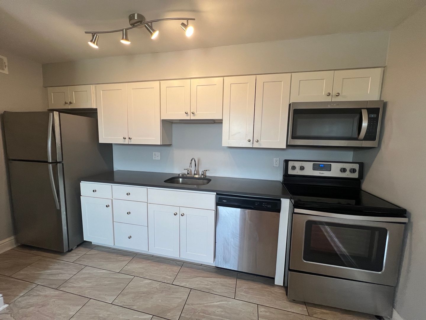 Modern, updated kitchen featuring sleek grey quartz countertops and stainless steel refrigerator, dishwasher, microwave and electric stove