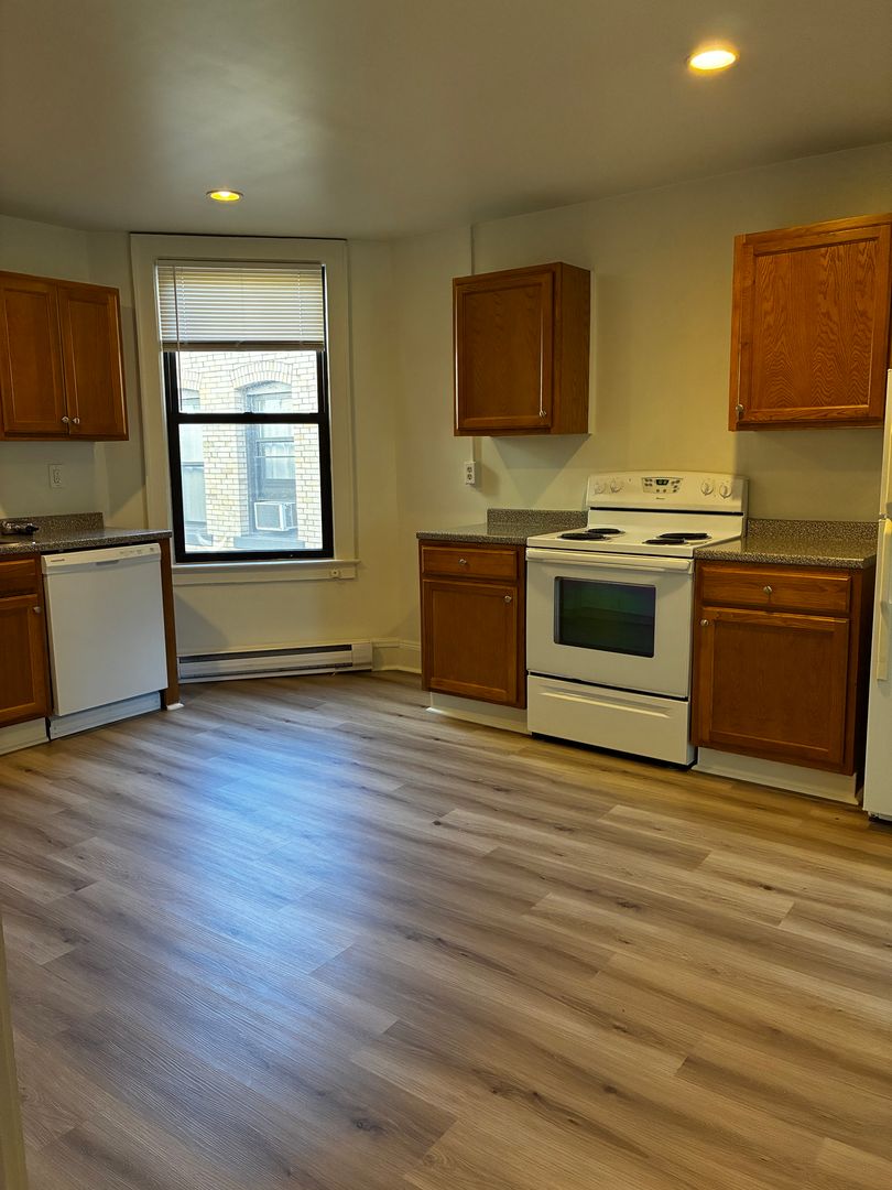Fully equipped kitchen with refrigerator, electric stove, and dishwasher