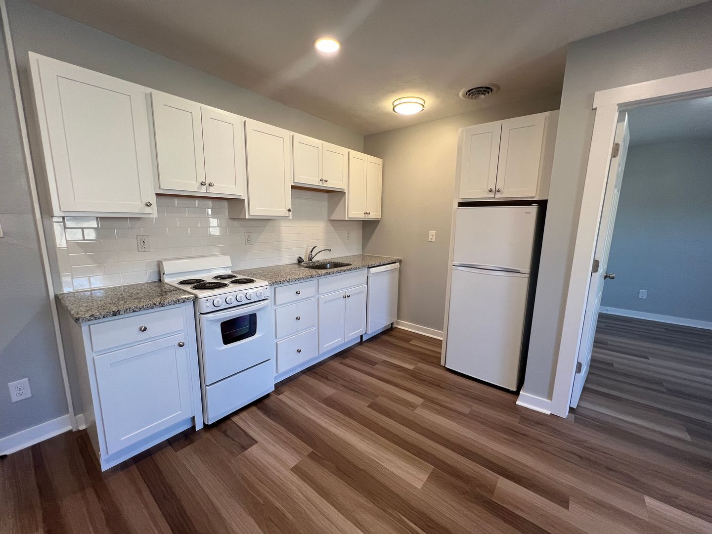 Modern kitchen with refrigerator, dishwasher, and electric stove