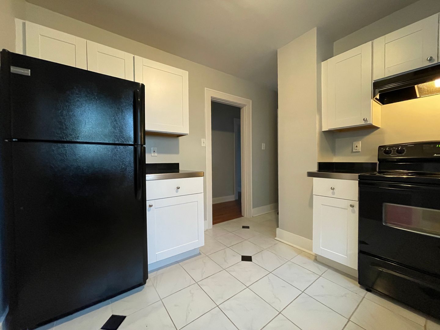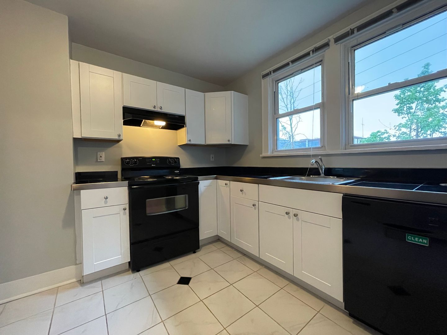 Modern kitchen with sleek black granite countertops, refrigerator, dishwasher and electric stove