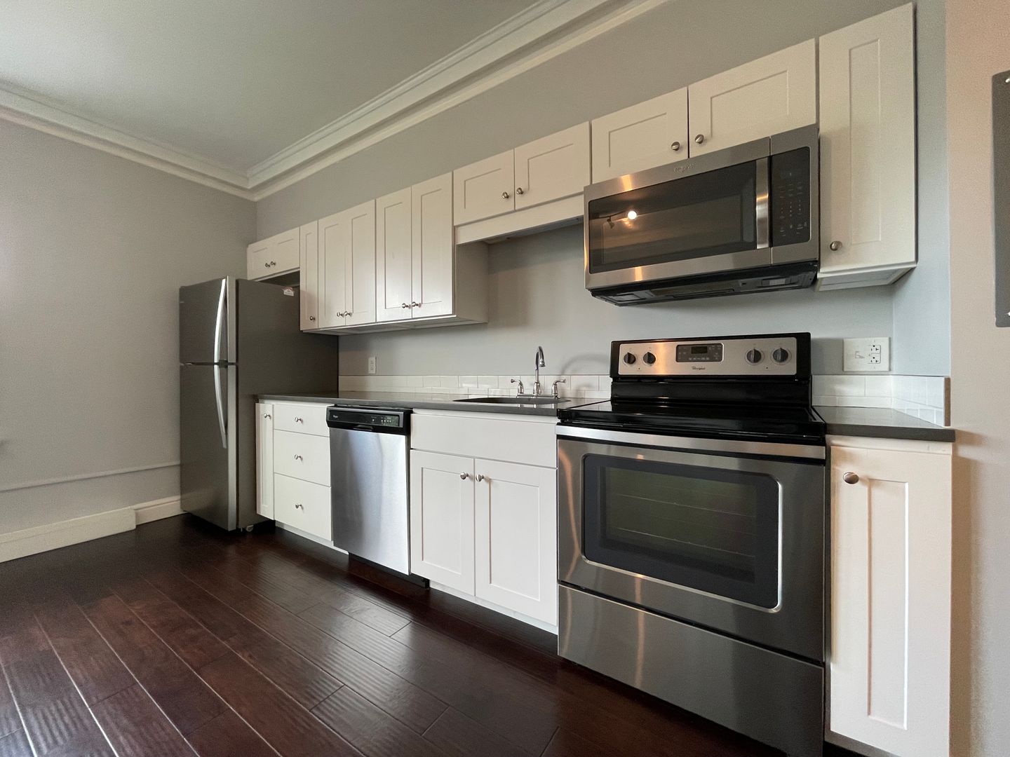 Modern kitchen with refrigerator, electric stove, microwave, and dishwasher