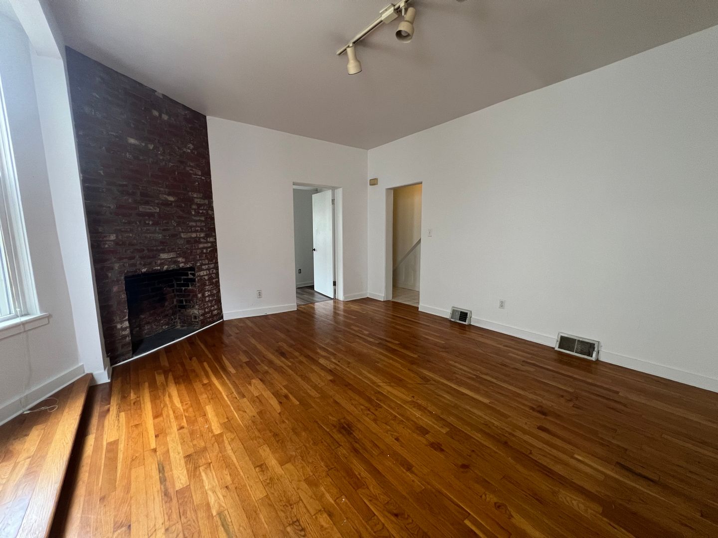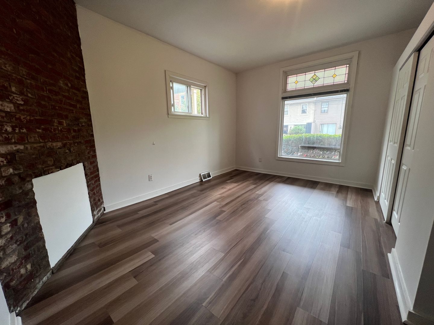 Cozy decorative brick fireplaces in both the living room and bedroom